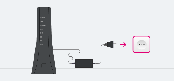 Helyezd áram alá a Telekom Wi-Fi Extra eszközt és várd meg, hogy a Power, a LAN1, a 2.4GHz, az 5GHz, a 6GHz LED-ek folyamatosan zölden, az Internet LED pedig folyamatosan kéken világítsanak az eszközön.