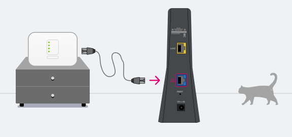 A csomagban mellékelt Ethernet kábellel csatlakoztasd a Mesh eszközt a modemhez. Az Ethernet kábelt a Mesh eszköz kék színű csatlakozójához (2.5G LAN1) és a modem 2.5G LAN csatlakozójához csatlakoztasd.