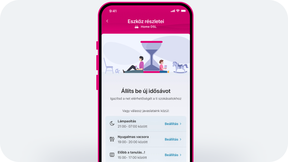 A Telekom alkalmazás segítségével egyszerűen kezedbe veheted az otthoni interneted irányítását és tudatosan figyelhetsz a digitális egyensúlyra is. Pár gombnyomással megoszthatod a Wi-Fi hozzáférést másokkal, egyesével kezelheted a csatlakozó eszközöket és akár szabályozhatod a gyerekek képernyőidejét is.