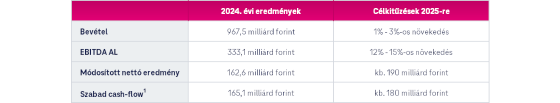 2025-re a Magyar Telekom stratégiai célkitűzései változatlanok maradnak. A digitális transzformációban elért sikerek erős alapot jelentenek a jövőre nézve. A további inflációkövető díjkorrekcióval együtt ez elősegíti azon célkitűzésünke, hogy 2025-ben 1%-3% közötti bevétel-növekedést érjünk el. Mindemellett a távközlési pótadó 2025-ben történő megszűnését figyelembe véve az EBITDA AL 12%-15% közötti növekedésére számítunk. Várakozásaink szerint a módosított nettó eredmény megközelítőleg 190 milliárd forint, a szabad cash-flow pedig várhatóan 180 milliárd forint körül alakul majd.”